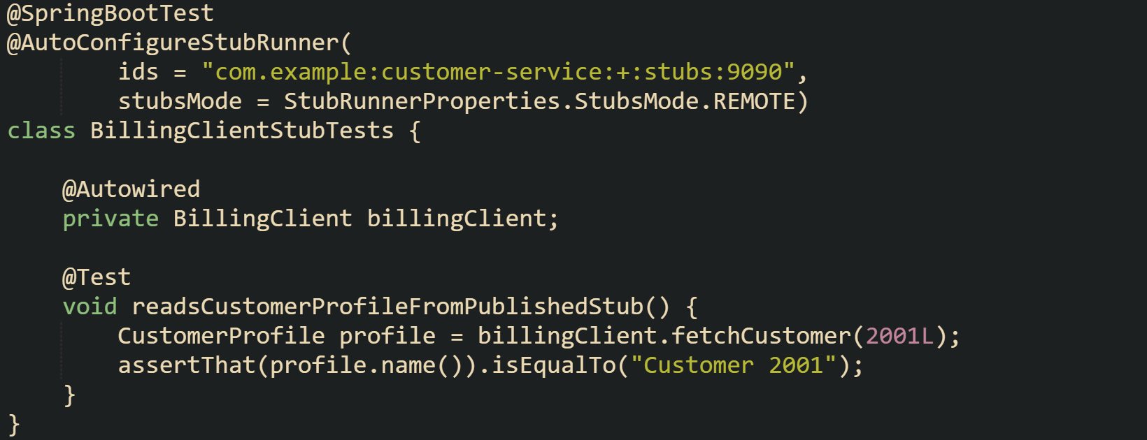 Consumer tests that rely on published stubs follow a pattern similar to the stub usage in the earlier section, but with configuration tuned for remote repositories. Spring Boot billing services that call customer-service can set up tests like this: