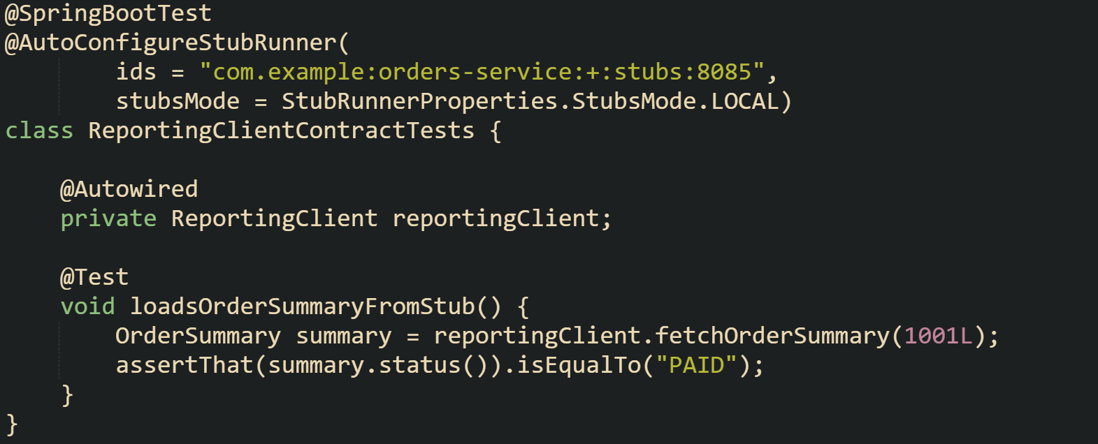 The @AutoConfigureStubRunner annotation starts a stub server that reads contract mappings from the orders-service stub artifact. The ReportingClient class can call http://localhost:8085 during this test and treat it as if it were the real provider. If a change in the contracts modifies the response structure, this test gives fast feedback to the consumer long before any shared environment enters the picture.