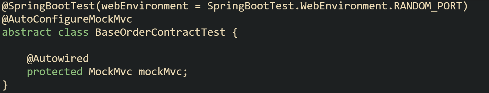 Typical provider side contract test classes in Spring Boot projects extend a base class created for Spring Cloud Contract and then gain generated test methods. One slightly simplified base class can be: