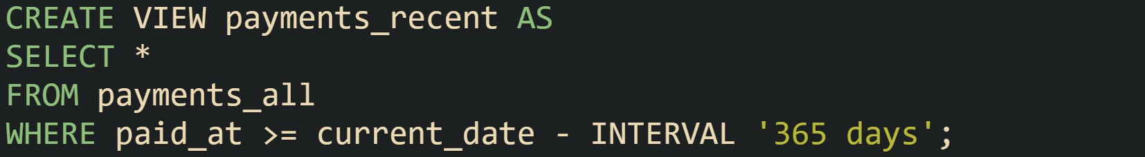 Client code that only needs to read data can point at payments_all and still benefit from indexes on payments and payments_archive. Queries with filters on ranges or customer identifiers push down into the base tables, and the planner merges results afterward.