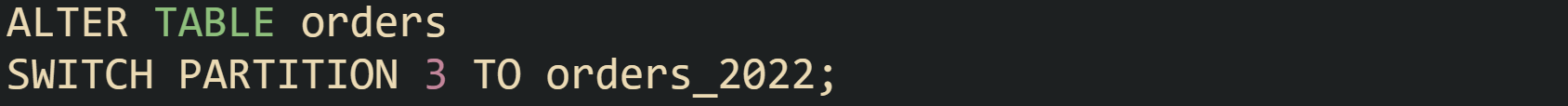 That switch moves all rows that fall into partition 3 into orders_2022 without scanning individual rows. Tuning the partition function so that partition 3 lines up with a full year such as 2022 keeps the process predictable.