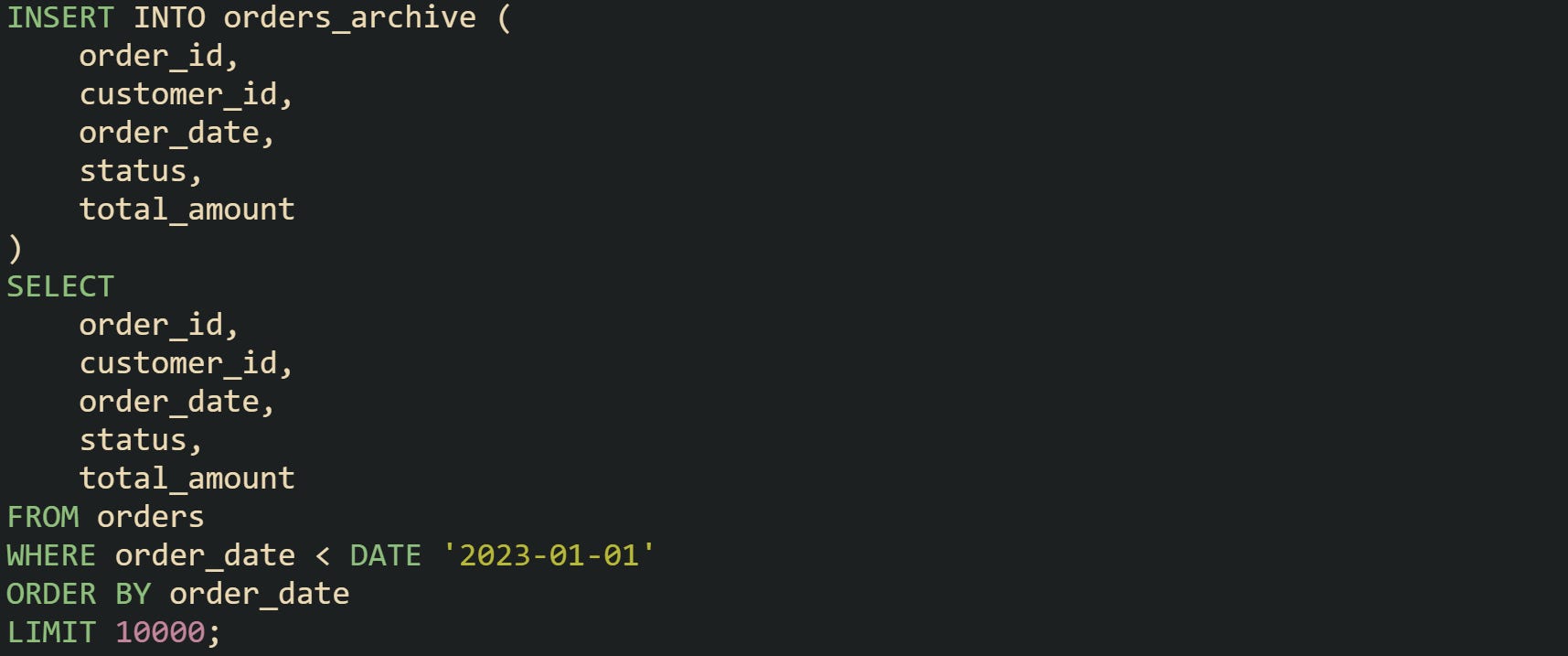 Very large datasets call for smaller bites. Long running INSERT and DELETE statements chew through transaction logs and can hold locks for longer than anyone wants. To manage that pressure, many teams batch the work. A common method takes a fixed number of rows per run, staggered across the night or low traffic periods. Here is one way to pull batches by ordering on the date field and limiting the number of rows per pass in a database that supports LIMIT: