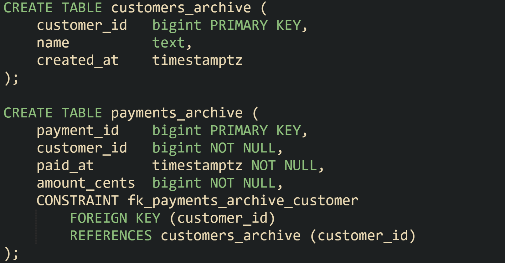 Table definitions in archive schemas can keep foreign keys as well. That choice keeps link structure intact inside the archive and gives confidence that history tables still follow relational rules. For example, a payments_archive table can retain its foreign key to customers_archive so that archived payments always point at archived customers. DDL for that layout can look like this in PostgreSQL: