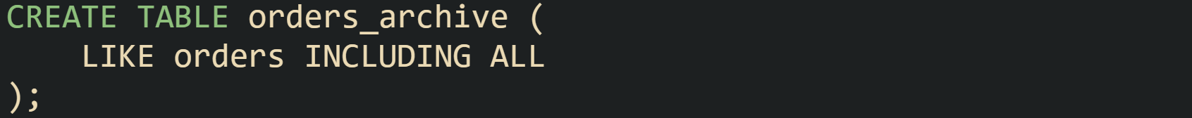 That single statement clones column definitions and indexes from orders into orders_archive. Some teams follow it with extra DDL that removes secondary indexes that only matter for live traffic or adds archive specific indexes for typical reporting ranges.