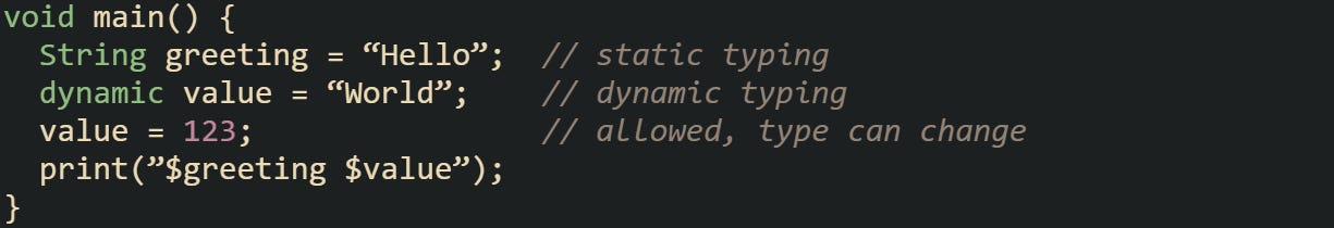 The compiler treats greeting and value differently. With greeting, the type is locked in, so the compiler can optimize string operations. With value, type checks happen at runtime. This duality is one reason Dart adapts well to both quick prototypes and larger structured projects.