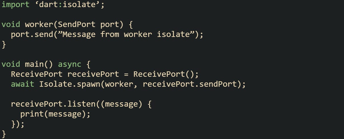 In this case, a worker isolate communicates back to the main isolate with a simple string. The separation of memory between isolates prevents race conditions that occur in systems built on shared state.