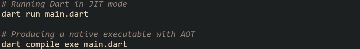 The first command runs through the VM in JIT mode. The second produces a self-contained native executable that includes a small Dart runtime, which means you can run it directly without calling the dart command. This flexibility is a big reason Dart can act as both a rapid development tool and a production-ready language.