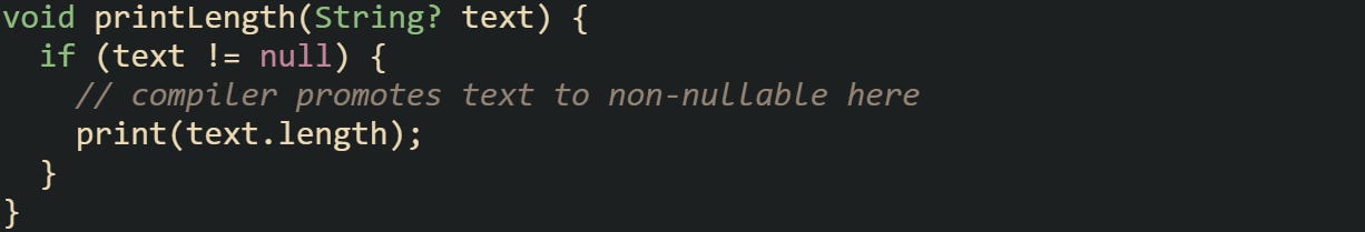 Another feature tied to null safety is type promotion. Dart can analyze conditions and promote a nullable type to non-nullable inside certain code blocks, removing the need for repetitive checks.