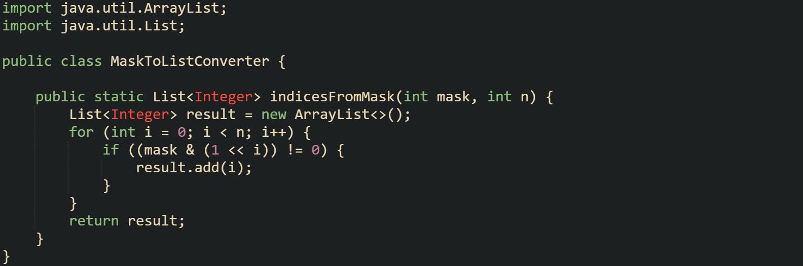 Lots of developers also like having a helper that converts a mask into an int[] or List<Integer> of indices, so that call sites can pass around concrete element lists when needed. Conversion from mask to list stays mechanical.