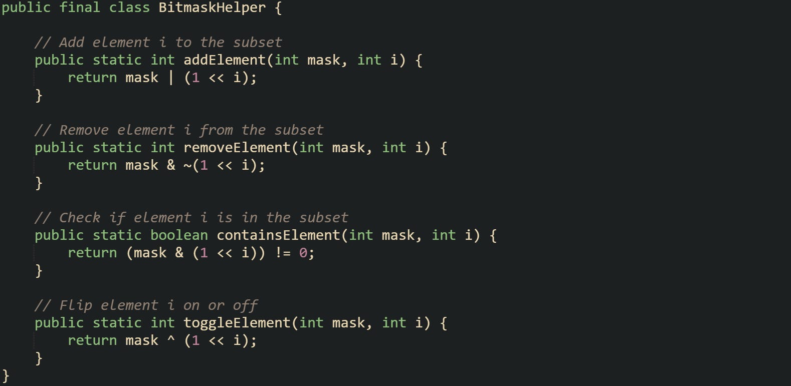 ![public class BitmaskPrintExample { public static void main(String[] args) { int mask = 0; mask = BitmaskHelper.addElement(mask, 1); // add element 1 mask = BitmaskHelper.addElement(mask, 3); // add element 3 System.out.println("Mask value: " + mask); // prints 10 for (int i = 0; i < 4; i++) { if (BitmaskHelper.containsElement(mask, i)) { System.out.println("Element " + i + " is present"); } } } } public class BitmaskPrintExample { public static void main(String[] args) { int mask = 0; mask = BitmaskHelper.addElement(mask, 1); // add element 1 mask = BitmaskHelper.addElement(mask, 3); // add element 3 System.out.println("Mask value: " + mask); // prints 10 for (int i = 0; i < 4; i++) { if (BitmaskHelper.containsElement(mask, i)) { System.out.println("Element " + i + " is present"); } } } }](https://substackcdn.com/image/fetch/$s_!B5z5!,w_1456,c_limit,f_auto,q_auto:good,fl_progressive:steep/https%3A%2F%2Fsubstack-post-media.s3.amazonaws.com%2Fpublic%2Fimages%2Fc66efb36-3a5b-4649-a20b-53fe5da89e44_1579x594.png)