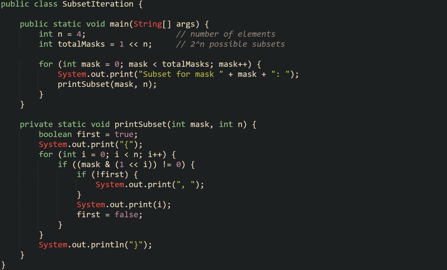 ![public class SubsetIteration { public static void main(String[] args) { int n = 4; // number of elements int totalMasks = 1 << n; // 2^n possible subsets for (int mask = 0; mask < totalMasks; mask++) { System.out.print("Subset for mask " + mask + ": "); printSubset(mask, n); } } private static void printSubset(int mask, int n) { boolean first = true; System.out.print("{"); for (int i = 0; i < n; i++) { if ((mask & (1 << i)) != 0) { if (!first) { System.out.print(", "); } System.out.print(i); first = false; } } System.out.println("}"); } } public class SubsetIteration { public static void main(String[] args) { int n = 4; // number of elements int totalMasks = 1 << n; // 2^n possible subsets for (int mask = 0; mask < totalMasks; mask++) { System.out.print("Subset for mask " + mask + ": "); printSubset(mask, n); } } private static void printSubset(int mask, int n) { boolean first = true; System.out.print("{"); for (int i = 0; i < n; i++) { if ((mask & (1 << i)) != 0) { if (!first) { System.out.print(", "); } System.out.print(i); first = false; } } System.out.println("}"); } }](https://substackcdn.com/image/fetch/$s_!ILxj!,w_1456,c_limit,f_auto,q_auto:good,fl_progressive:steep/https%3A%2F%2Fsubstack-post-media.s3.amazonaws.com%2Fpublic%2Fimages%2F87bd7be4-c3b2-466a-8273-d0d65cdf8bfd_1556x942.png)