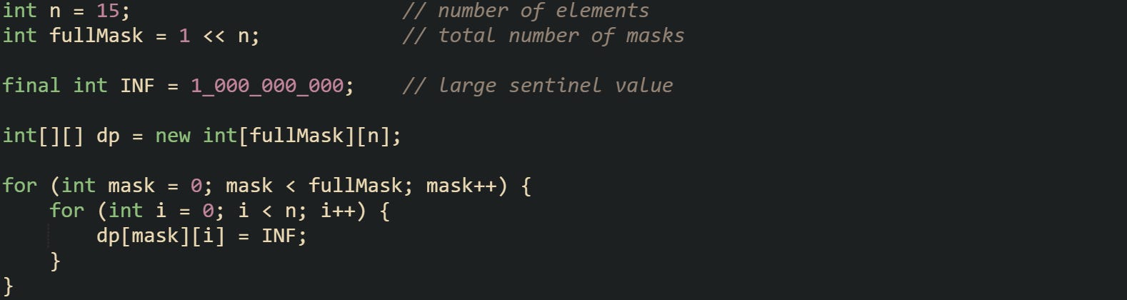 ![int n = 15; // number of elements int fullMask = 1 << n; // total number of masks final int INF = 1_000_000_000; // large sentinel value int[][] dp = new int[fullMask][n]; for (int mask = 0; mask < fullMask; mask++) { for (int i = 0; i < n; i++) { dp[mask][i] = INF; } } int n = 15; // number of elements int fullMask = 1 << n; // total number of masks final int INF = 1_000_000_000; // large sentinel value int[][] dp = new int[fullMask][n]; for (int mask = 0; mask < fullMask; mask++) { for (int i = 0; i < n; i++) { dp[mask][i] = INF; } }](https://substackcdn.com/image/fetch/$s_!KntD!,w_1456,c_limit,f_auto,q_auto:good,fl_progressive:steep/https%3A%2F%2Fsubstack-post-media.s3.amazonaws.com%2Fpublic%2Fimages%2F5b49c844-00eb-419d-a80d-d4cbfec1d7bb_1578x420.png)