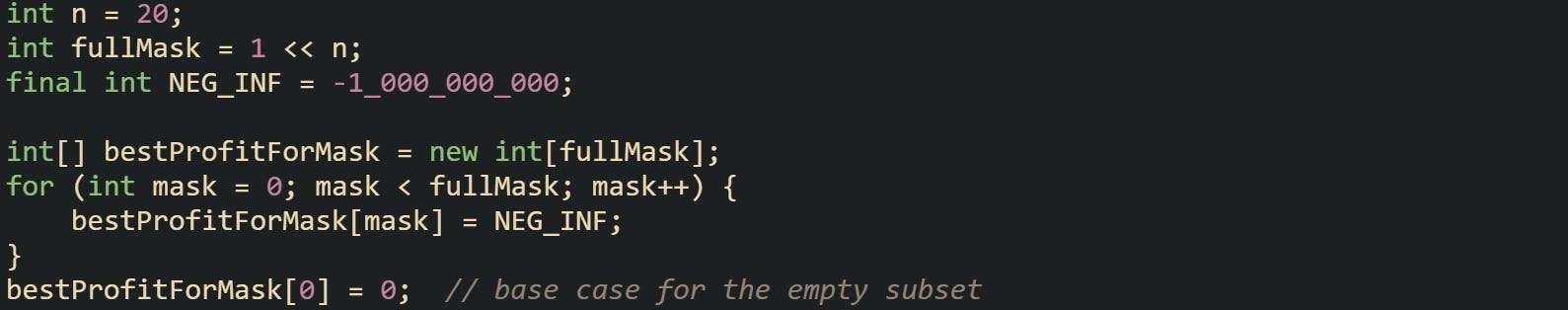 ![int n = 20; int fullMask = 1 << n; final int NEG_INF = -1_000_000_000; int[] bestProfitForMask = new int[fullMask]; for (int mask = 0; mask < fullMask; mask++) { bestProfitForMask[mask] = NEG_INF; } bestProfitForMask[0] = 0; // base case for the empty subset int n = 20; int fullMask = 1 << n; final int NEG_INF = -1_000_000_000; int[] bestProfitForMask = new int[fullMask]; for (int mask = 0; mask < fullMask; mask++) { bestProfitForMask[mask] = NEG_INF; } bestProfitForMask[0] = 0; // base case for the empty subset](https://substackcdn.com/image/fetch/$s_!QjZv!,w_1456,c_limit,f_auto,q_auto:good,fl_progressive:steep/https%3A%2F%2Fsubstack-post-media.s3.amazonaws.com%2Fpublic%2Fimages%2F94369906-548d-4379-b43d-a0b22e530879_1589x314.png)