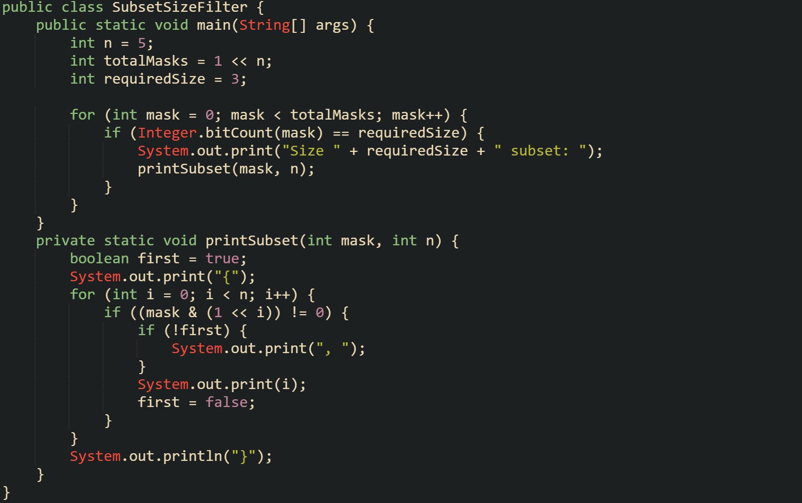 ![public class SubsetSizeFilter { public static void main(String[] args) { int n = 5; int totalMasks = 1 << n; int requiredSize = 3; for (int mask = 0; mask < totalMasks; mask++) { if (Integer.bitCount(mask) == requiredSize) { System.out.print("Size " + requiredSize + " subset: "); printSubset(mask, n); } } } private static void printSubset(int mask, int n) { boolean first = true; System.out.print("{"); for (int i = 0; i < n; i++) { if ((mask & (1 << i)) != 0) { if (!first) { System.out.print(", "); } System.out.print(i); first = false; } } System.out.println("}"); } } public class SubsetSizeFilter { public static void main(String[] args) { int n = 5; int totalMasks = 1 << n; int requiredSize = 3; for (int mask = 0; mask < totalMasks; mask++) { if (Integer.bitCount(mask) == requiredSize) { System.out.print("Size " + requiredSize + " subset: "); printSubset(mask, n); } } } private static void printSubset(int mask, int n) { boolean first = true; System.out.print("{"); for (int i = 0; i < n; i++) { if ((mask & (1 << i)) != 0) { if (!first) { System.out.print(", "); } System.out.print(i); first = false; } } System.out.println("}"); } }](https://substackcdn.com/image/fetch/$s_!YmXS!,w_1456,c_limit,f_auto,q_auto:good,fl_progressive:steep/https%3A%2F%2Fsubstack-post-media.s3.amazonaws.com%2Fpublic%2Fimages%2F0c983a72-4d1b-4214-9cd1-e684cd281b7c_1561x980.png)