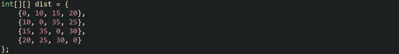 ![int[][] dist = { {0, 10, 15, 20}, {10, 0, 35, 25}, {15, 35, 0, 30}, {20, 25, 30, 0} }; int[][] dist = { {0, 10, 15, 20}, {10, 0, 35, 25}, {15, 35, 0, 30}, {20, 25, 30, 0} };](https://substackcdn.com/image/fetch/$s_!nF27!,w_1456,c_limit,f_auto,q_auto:good,fl_progressive:steep/https%3A%2F%2Fsubstack-post-media.s3.amazonaws.com%2Fpublic%2Fimages%2Fefe45e2a-8492-4947-9798-bc07150e39a4_1552x210.png)