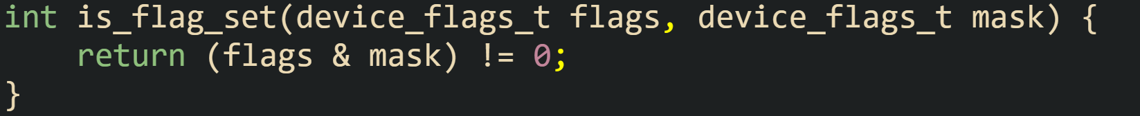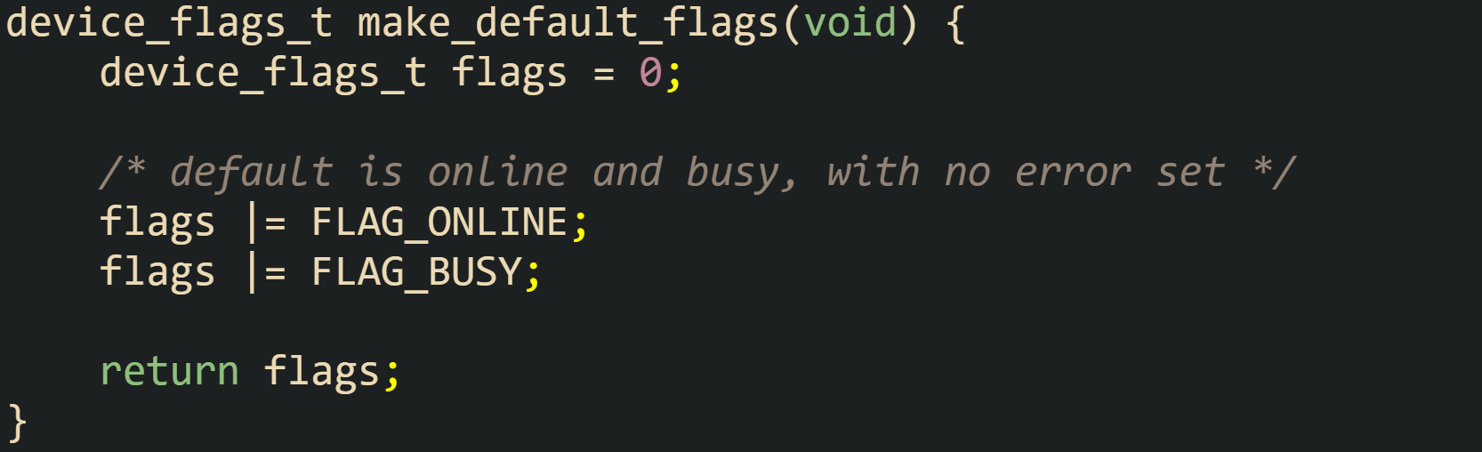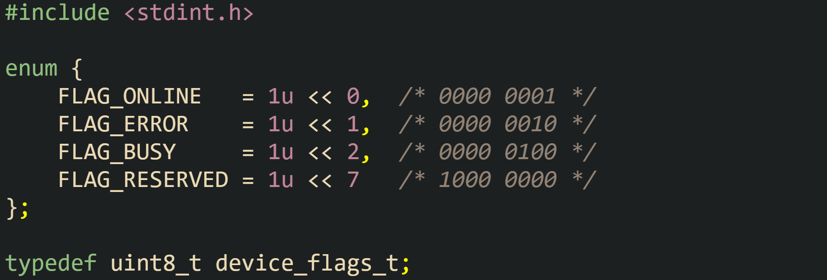 These constants assign bit 0 to an online flag, bit 1 to an error flag, bit 2 to a busy flag, and bit 7 to a reserved flag. A device_flags_t value can hold any combination of those bits, which means a single byte reflects multiple pieces of state at once.
