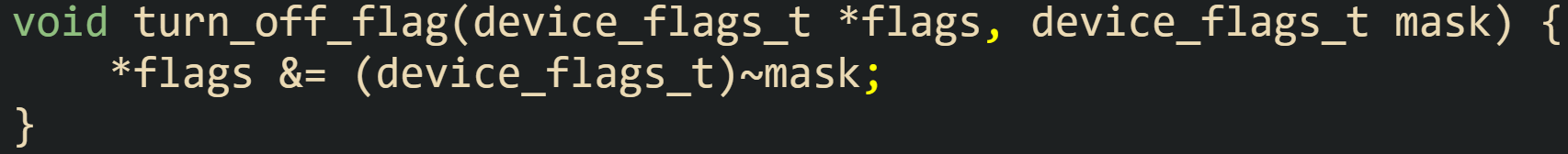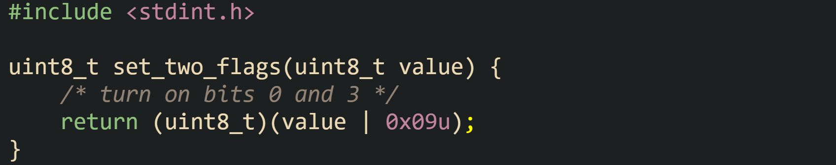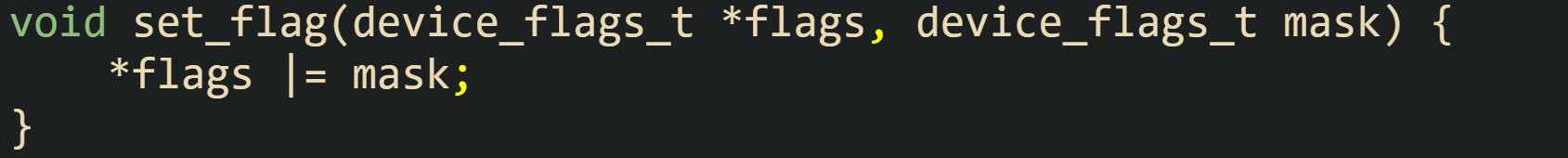 Here, the pointer flags points to the variable being updated, and the call *flags |= mask guarantees that any bit that was already 1 stays at 1, while any bit that is 1 in mask becomes 1 in *flags. Bits set to 0 in mask place no requirements on the result and stay at whatever value they already held.