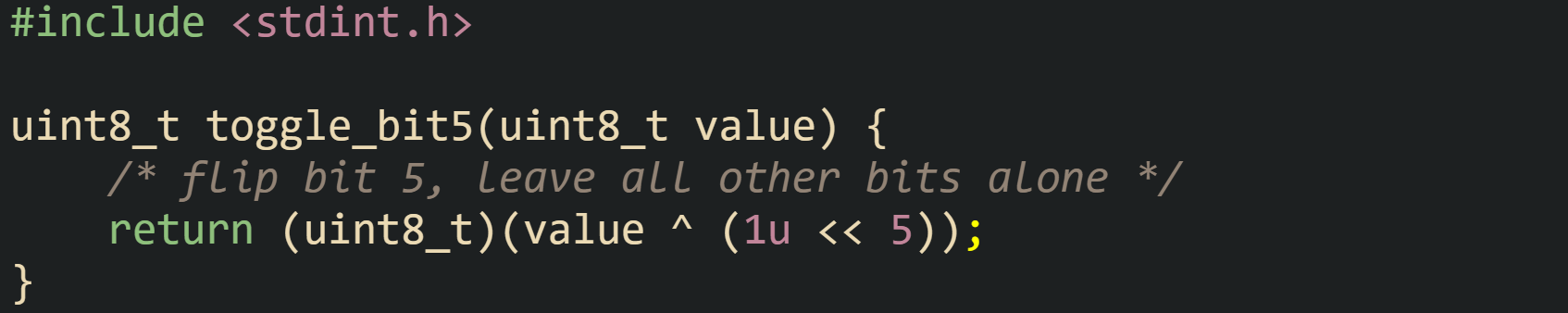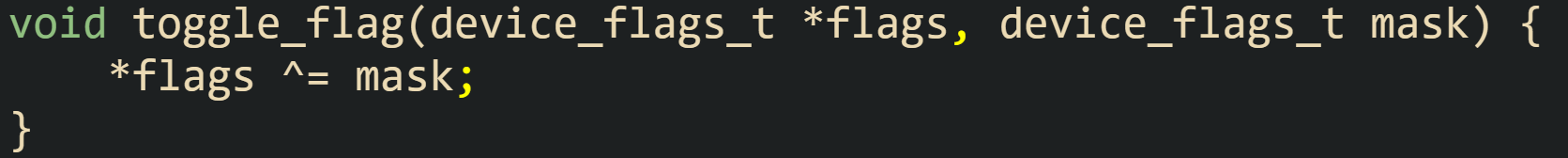 Calling toggle_flag(&flags, FLAG_BUSY) on a variable that currently has the busy bit set will turn that bit off while keeping all other bits the same. Calling it again with the same mask turns the busy bit back on. This symmetry makes XOR a natural tool for on or off toggles in user interfaces, state machines, or debug toggles that cycle through branches.