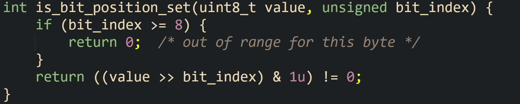 This helper is_bit_position_set, moves the requested bit down to position 0 with a right shift and then masks with 1u. The result is either 0 or 1, and the comparison with zero yields an integer result that fits common C idioms for boolean checks.