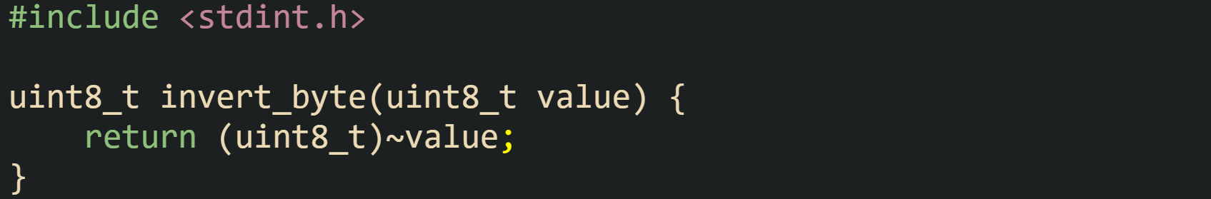 The function invert_byte returns the bitwise complement of the input, which can be useful with hardware where a flag is active low and stored as 0 for on and 1 for off.