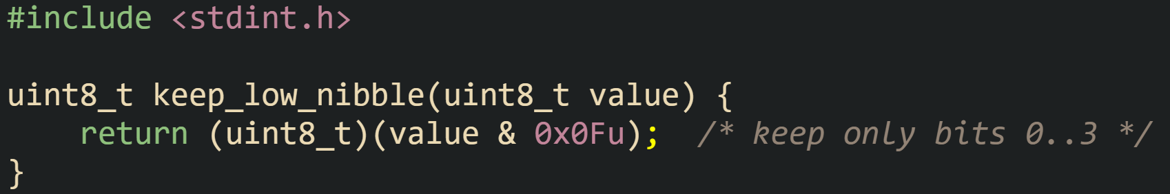 The function keep_low_nibble uses the mask 0x0Fu, which has its low four bits set to 1. Any bits in positions 4 through 7 of value become 0 in the result, while the low four bits remain unchanged.