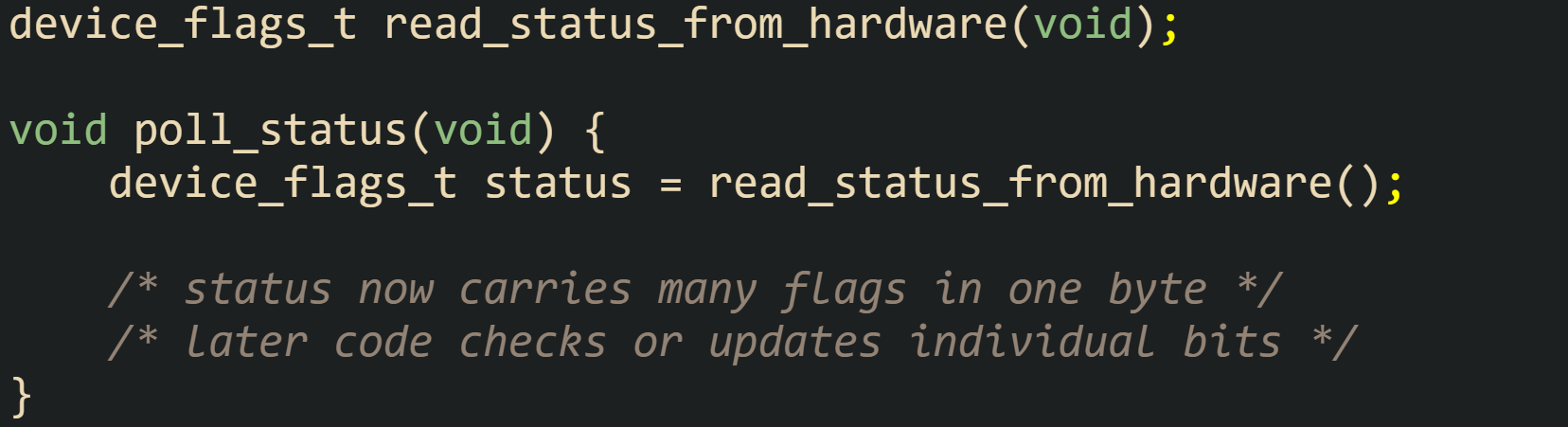 The function read_status_from_hardware stands in for whatever platform specific routine fetches the byte from memory mapped I/O or a driver call. The important detail is that status is a compact container for several boolean properties, not a single numeric quantity.
