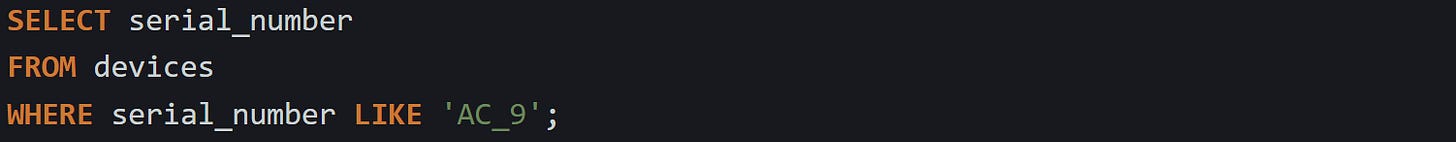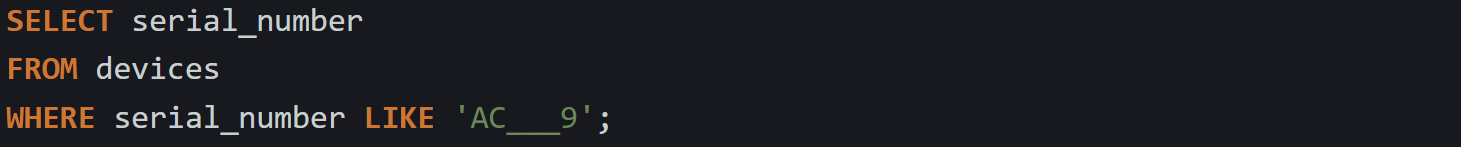 The underscore wildcard matches exactly one character. It’s useful when the structure of the string is predictable but the content varies. For example, if serial numbers follow a pattern and you want to find values that begin with AC, followed by one character, and then end in 9, you could write: