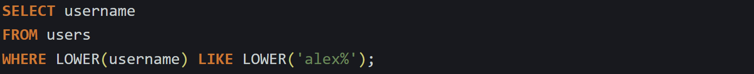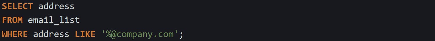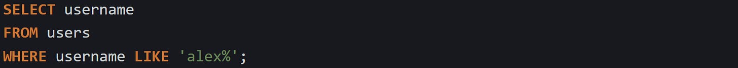 If the pattern starts with %, the database has no fixed point to begin narrowing the search, so it checks each value. That kind of scan is slower because it can’t take advantage of an index. But when the pattern begins with fixed text and ends with %, like this: