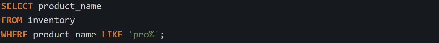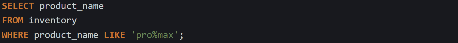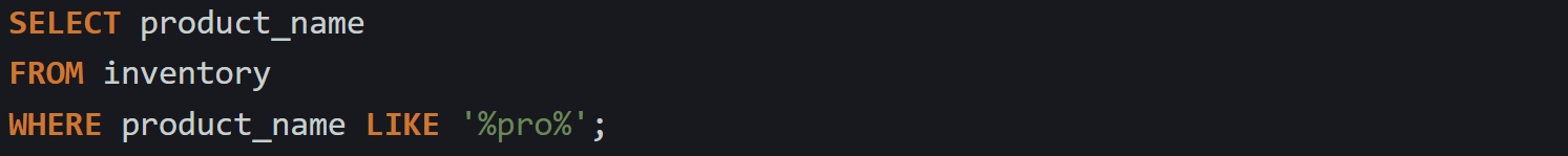 The percent sign matches any number of characters, including none at all. You can use it to look for values that contain something inside them, or values that start or end with a certain string. Here’s a case where the query searches for product names that include the word pro somewhere in the text.