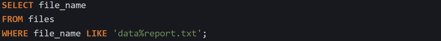 That will match something like ACXYZ9 or ACabc9, as long as there are exactly three characters before the 9. The difference between _ and % is that _ never adjusts. It expects one character per underscore. This is helpful when searching for structured data like codes or identifiers where the length and position of characters matter.