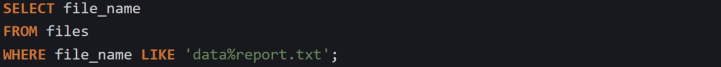 Suppose you need every file named data%report.txt. The basic pattern does not work:
