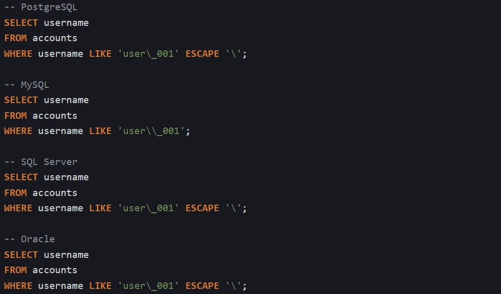 MySQL needs two backslashes because a backslash escapes the next character inside its string literal. PostgreSQL keeps a single backslash when standard_conforming_strings is on, so only one is required there. SQL Server and Oracle accept a single backslash once the ESCAPE '\' clause is present.