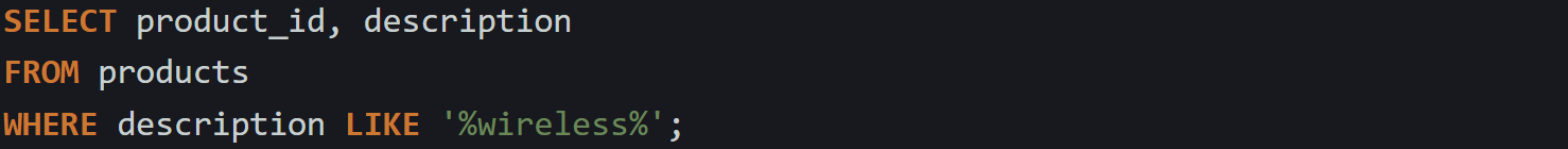 This checks every description and looks for a match anywhere in the string. It matches wireless keyboard, compact and wireless, and even ultrawirelesscombo. But the cost is high. The engine has to scan through each value from start to finish, comparing one character at a time. On small datasets, it’s not a big deal. On larger ones, it can slow things down.