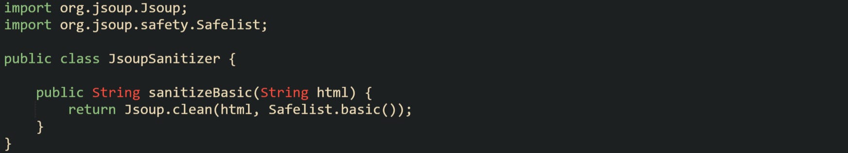 Some teams prefer Jsoup for sanitization. Jsoup parses HTML into a node tree and then filters that tree through a Safelist. Current versions use Safelist rather than the older Whitelist class, and the Jsoup.clean method applies the safelist rules to produce a safer HTML string.