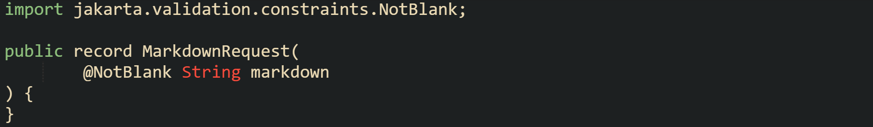 With annotations like @NotBlank, Spring Boot can respond with a 400 status code when a client sends an empty string. That keeps the Markdown service from handling invalid input and keeps error handling localized near the HTTP layer.