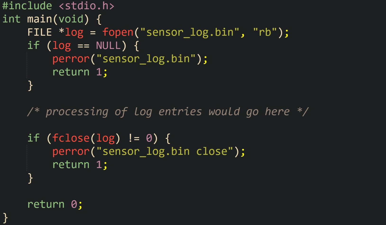 Let’s look at a example that opens a sensor log in binary read mode and checks for errors through perror, which formats the current errno value as text:
