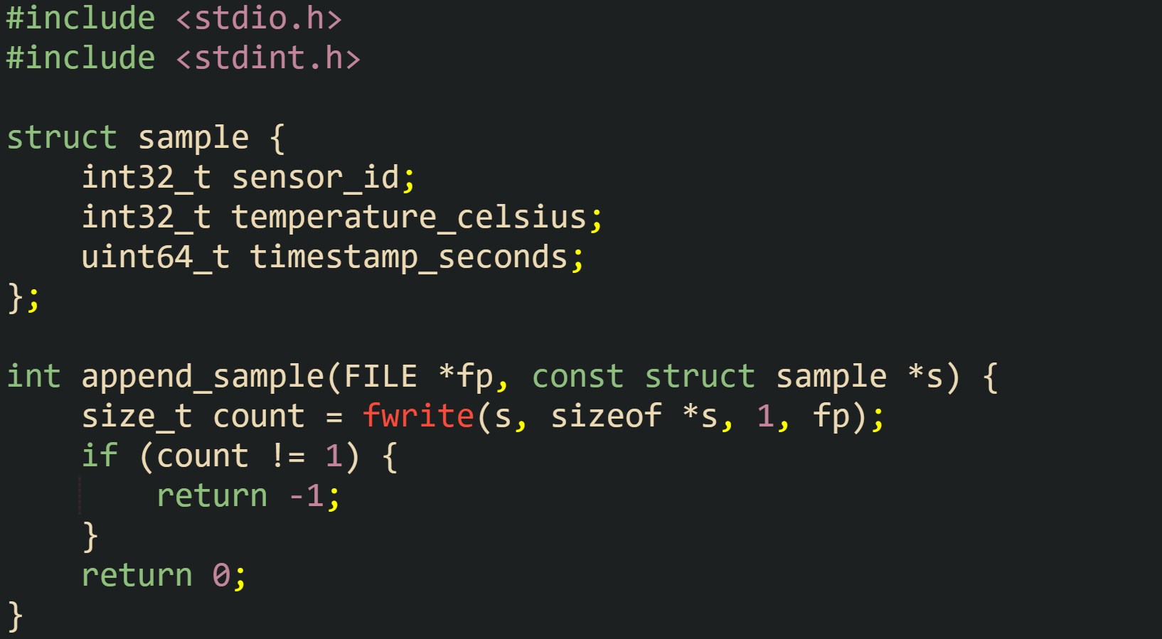Let’s take a look at a short example that writes fixed size binary records, where the code defines a record type for temperature samples and appends a new sample to a data file:
