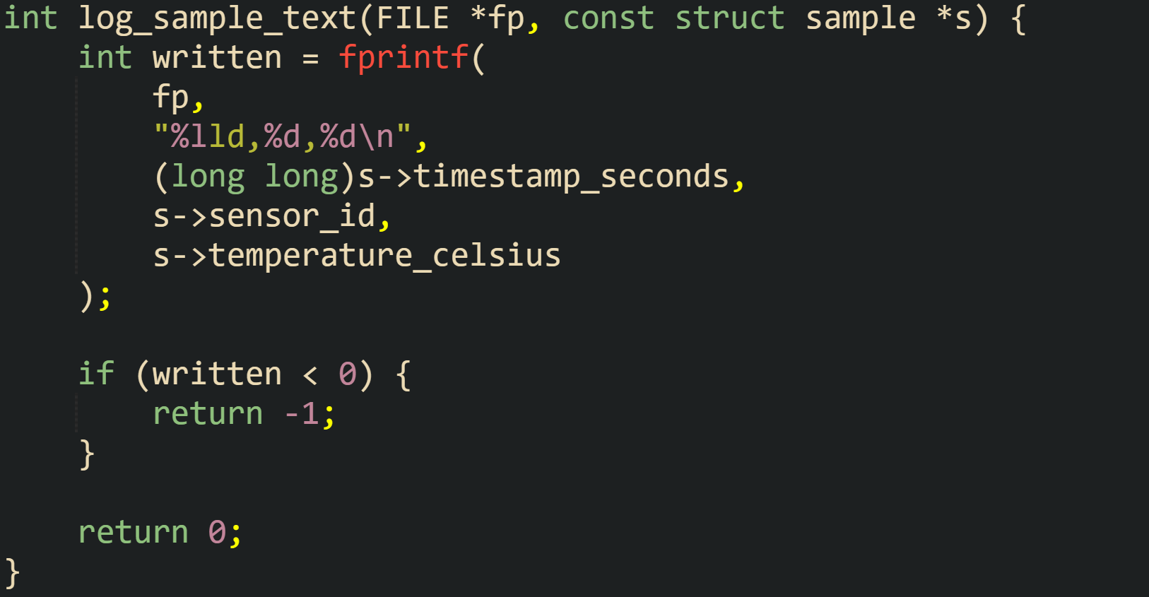 In this, the format string %lld,%d,%d\n converts the timestamp to a long long integer in decimal form, then writes the sensor id and temperature separated by commas, followed by a newline. fprintf sends the formatted characters into the stream buffer associated with fp. When that buffer fills or when the stream is flushed, the bytes travel to the underlying operating system handle.