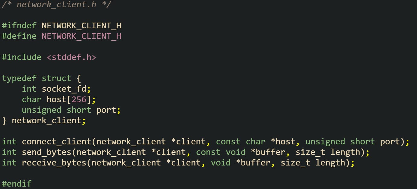 ![/* network_client.h */ #ifndef NETWORK_CLIENT_H #define NETWORK_CLIENT_H #include <stddef.h> typedef struct { int socket_fd; char host[256]; unsigned short port; } network_client; int connect_client(network_client *client, const char *host, unsigned short port); int send_bytes(network_client *client, const void *buffer, size_t length); int receive_bytes(network_client *client, void *buffer, size_t length); #endif /* network_client.h */ #ifndef NETWORK_CLIENT_H #define NETWORK_CLIENT_H #include <stddef.h> typedef struct { int socket_fd; char host[256]; unsigned short port; } network_client; int connect_client(network_client *client, const char *host, unsigned short port); int send_bytes(network_client *client, const void *buffer, size_t length); int receive_bytes(network_client *client, void *buffer, size_t length); #endif](https://substackcdn.com/image/fetch/$s_!xxKY!,w_2400,c_limit,f_auto,q_auto:good,fl_progressive:steep/https%3A%2F%2Fsubstack-post-media.s3.amazonaws.com%2Fpublic%2Fimages%2F3dbb6146-b9c7-4ef0-8f02-11ab1600617f_1382x627.png)