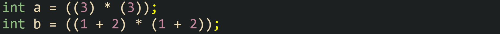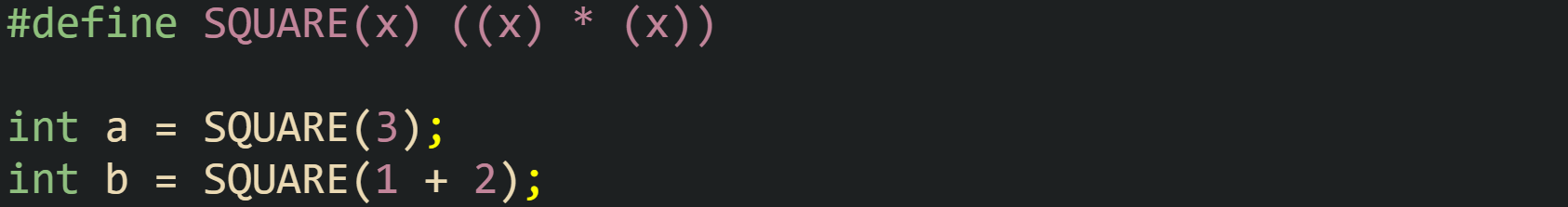 Parentheses wrapped around both the whole expansion and the parameter names in the body keep normal operator precedence rules from changing the meaning of expressions when the macro is used with more complex arguments. Without those parentheses, an expression such as SQUARE(1 + 2) could expand into code that evaluates in a different order.