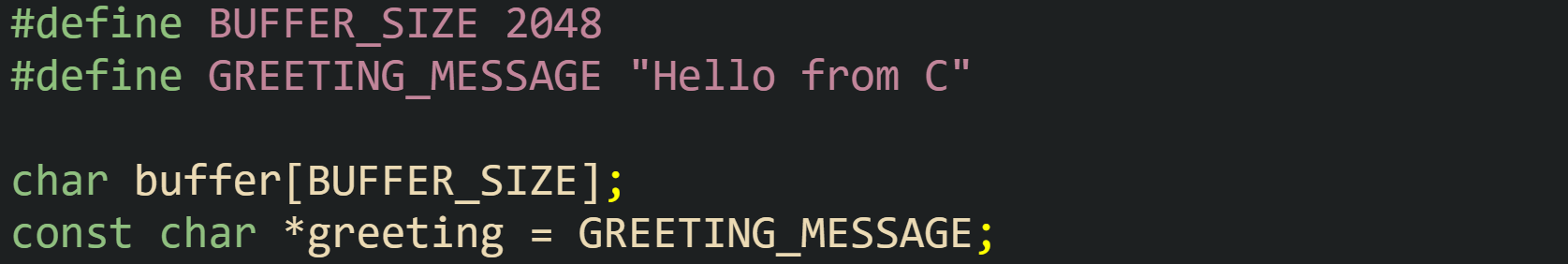 ![#define BUFFER_SIZE 2048 #define GREETING_MESSAGE "Hello from C" char buffer[BUFFER_SIZE]; const char *greeting = GREETING_MESSAGE; #define BUFFER_SIZE 2048 #define GREETING_MESSAGE "Hello from C" char buffer[BUFFER_SIZE]; const char *greeting = GREETING_MESSAGE;](https://substackcdn.com/image/fetch/$s_!hYWn!,w_1456,c_limit,f_auto,q_auto:good,fl_progressive:steep/https%3A%2F%2Fsubstack-post-media.s3.amazonaws.com%2Fpublic%2Fimages%2Fe1bbb56e-65cd-4b8c-a140-7210eaf95479_1675x282.png)