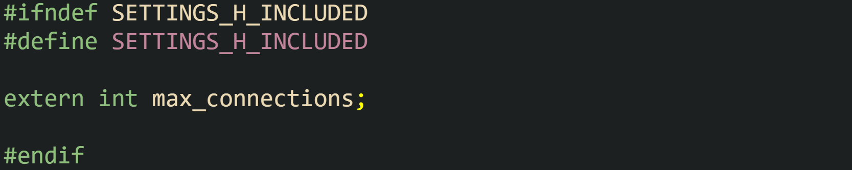 Here, main.c stays the same. During preprocessing, the first inclusion of settings.h defines SETTINGS_H_INCLUDED and leaves the declaration of max_connections in the translation unit. When server.h pulls in settings.h again, the #ifndef SETTINGS_H_INCLUDED test fails, so the entire guarded block is skipped. This final translation unit now holds a single declaration of max_connections, and a single definition needs to exist in exactly one .c file to satisfy the linker.