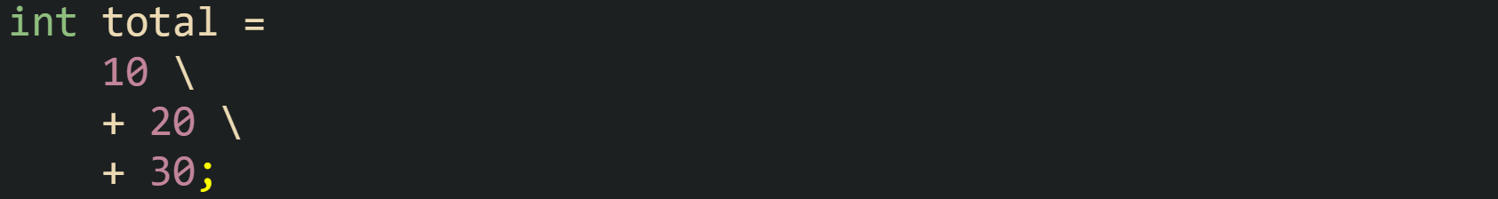 Before real compilation happens, the preprocessor treats the source file as a character stream and then gradually turns that stream into preprocessing tokens and directive actions. Line endings are normalized so that different operating systems and editors do not change how the code is seen. Backslash line continuations are handled at this early point as well. When a backslash sits as the last character on a physical line and a newline follows, those two characters are removed and the next physical line is glued to the end of the current logical line. That lets you split long logical lines in the editor without changing how the compiler eventually reads the expression.