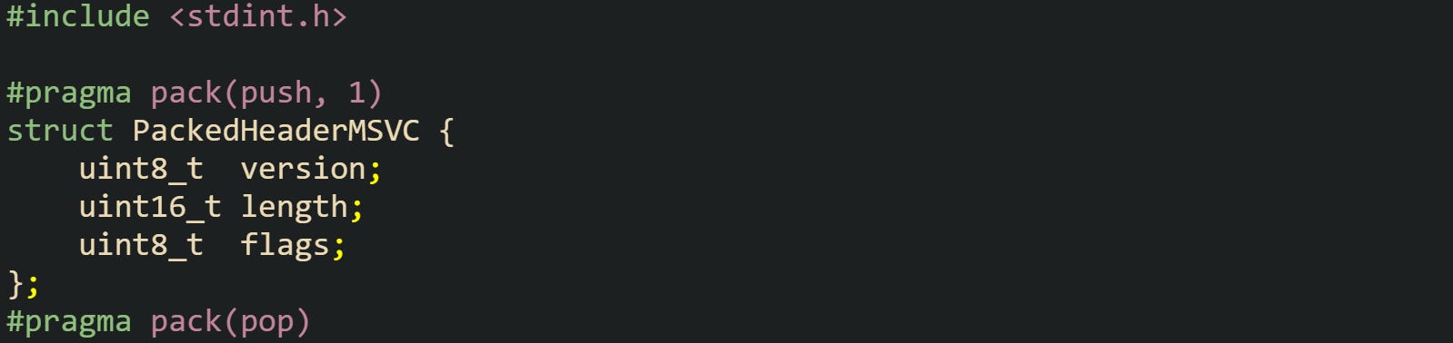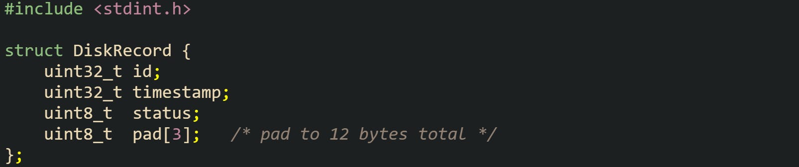 ![#include <stdint.h> struct DiskRecord { uint32_t id; uint32_t timestamp; uint8_t status; uint8_t pad[3]; /* pad to 12 bytes total */ }; #include <stdint.h> struct DiskRecord { uint32_t id; uint32_t timestamp; uint8_t status; uint8_t pad[3]; /* pad to 12 bytes total */ };](https://substackcdn.com/image/fetch/$s_!lJ-G!,w_1456,c_limit,f_auto,q_auto:good,fl_progressive:steep/https%3A%2F%2Fsubstack-post-media.s3.amazonaws.com%2Fpublic%2Fimages%2Ff4920dcf-8117-486f-8109-9c607e4ca14b_1606x336.png)