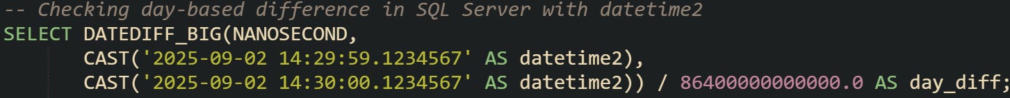 SQL Server provides the DATEDIFF function, which has a similar structure to MySQL’s TIMESTAMPDIFF. You specify a unit, a start point, and an end point. Behind the scenes, SQL Server converts timestamps into day counts and fractional ticks of a day before subtracting them.