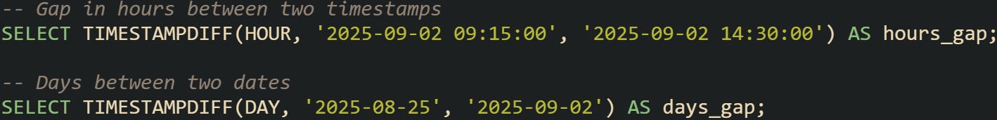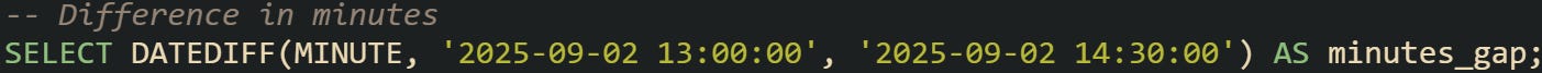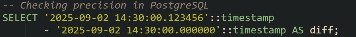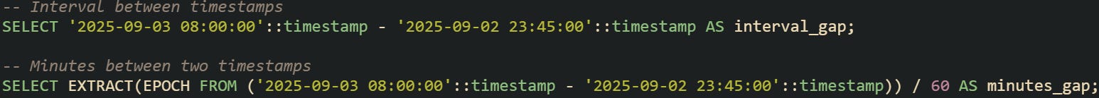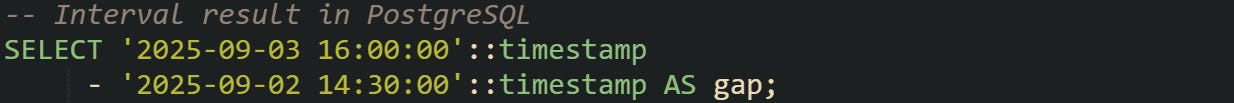 Every database that handles time data has to translate human-readable dates into something it can measure. A value like 2025-09-02 14:30:00 looks very basic to us, but the system needs to turn that into numbers it can compare with another timestamp. When a subtraction is performed, the database reduces both timestamps into a shared numeric unit and then computes the gap. After that, the difference is either returned directly or wrapped in a specialized type called INTERVAL.