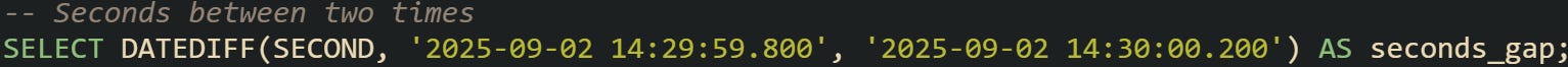 MySQL prefers a function-driven method rather than returning an interval directly. Internally, subtraction still happens in microseconds, but you request the final unit with TIMESTAMPDIFF. The difference is that the conversion into a friendly number happens inside the function instead of being returned as an interval object.