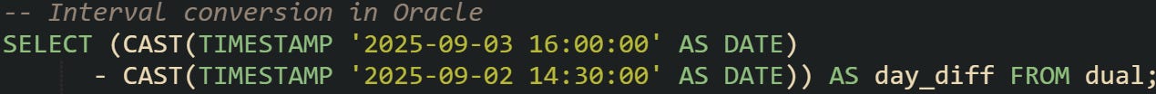Because DATE subtraction returns decimals for day differences, you get precision across smaller units without needing extra functions. Multiplying by 24 produces hours with fractional values included. That fractional part can be valuable when working with durations that don’t line up perfectly with whole numbers of hours. Oracle also supports explicit INTERVAL types when working with TIMESTAMP values, but for daily work with DATE arithmetic, the numeric result is often enough.