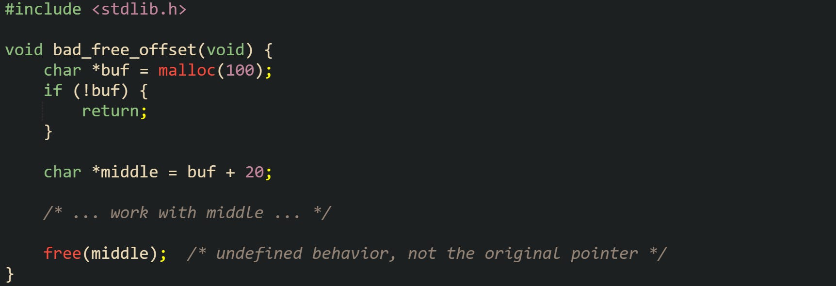 There is also a class of bugs where code passes a pointer into the middle of a valid block rather than the original pointer. The allocator expects the address it handed out, not some interior address. Any arithmetic that offsets the pointer needs to be undone before free is called.