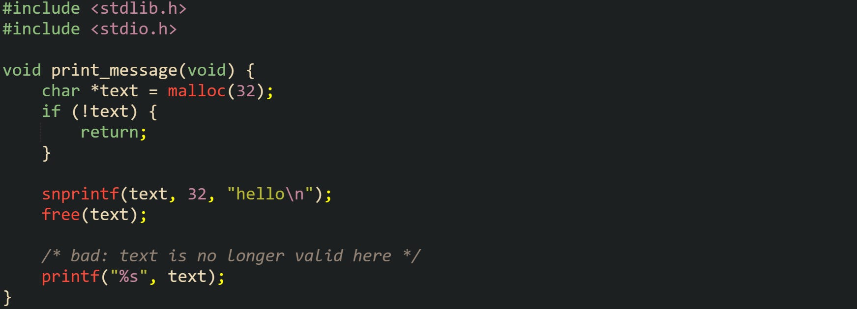 Use after free bugs take a different route. The allocator accepts a call to free, marks the block as no longer in use, and any later access to that memory through old pointers touches storage that may already hold unrelated data. This next example pairs a write and a read with a call to free in between: